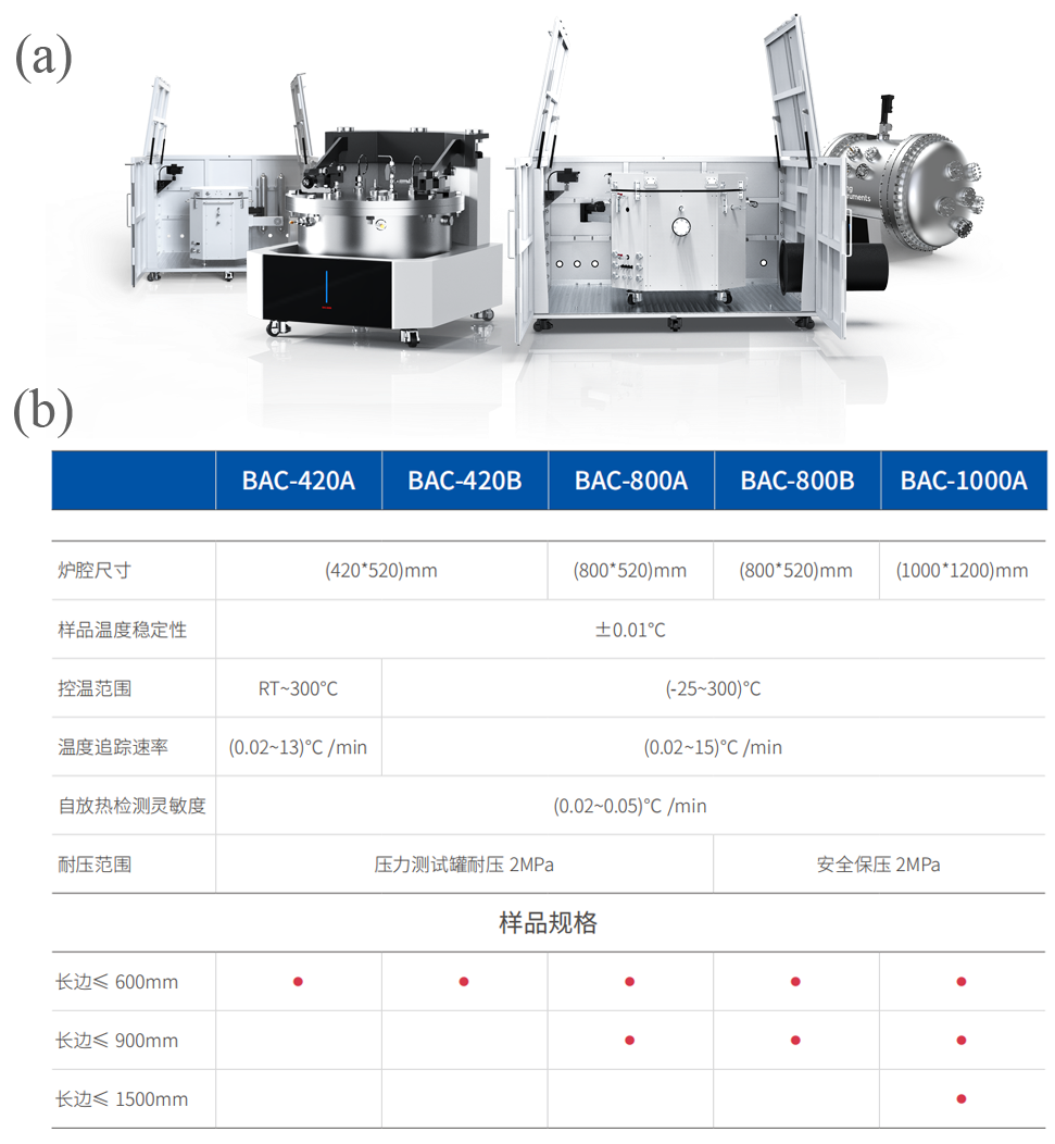 BAC-420A大型电池绝热量热仪0.01℃/min的自放热检测灵敏度及420*520mm的炉腔尺寸,让实验室在面对能量密度与电芯尺寸均日益庞大的样品时仍拥有极强的适应性。