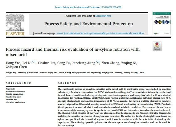 南京工业大学倪磊副教授团队在 Process Safety and Environmental Protection 期刊发表题为 Process hazard and thermal risk evaluation of m-xylene nitration with mixed acid 论文,该成果由国家自然科学基金项目(No.21927815, 51834007, 52274209) 支持。项目研究了间二甲苯混酸硝化工艺的过程危害及热风险评估;其中仰仪科技绝热加速量热仪被应用于对硝化产物的热失控测试及动力学分析,此外也对混酸硝化工艺的反应风险进行了评估。