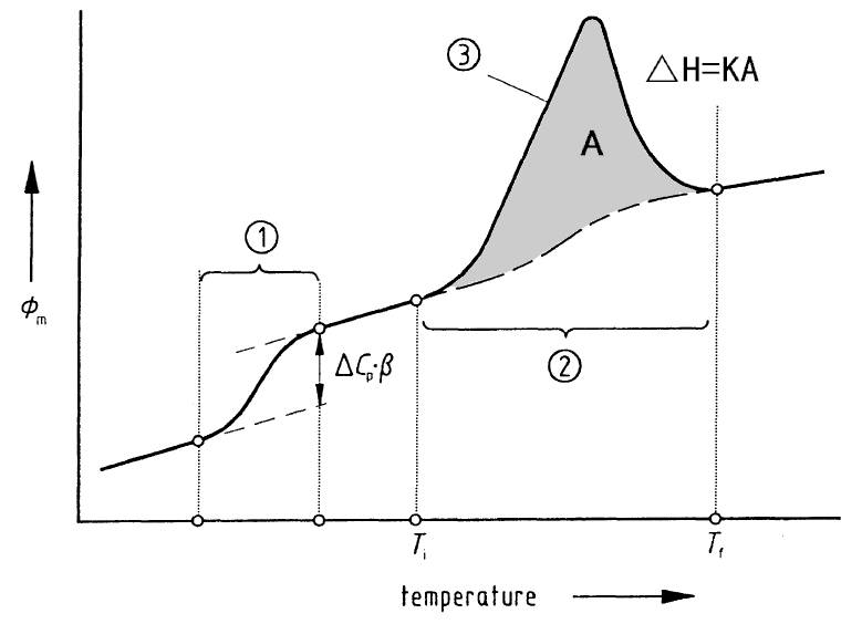 图3中①这里出现的基线台阶所代表的是试样在加热过程中出现了热容变换(一般是玻璃化转变过程),而热容改变量的计算公式为: