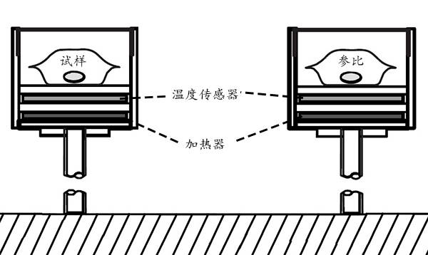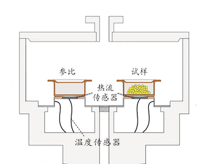 热流型DSC,通常也被认为是定量的DTA,它的仪器构造如图1。试样和参比都在一个加热板上加热,通过热流检测器可以测出参比和试样之间的热流差,从而准确定量,这也是DSC较之DTA的高级之处。