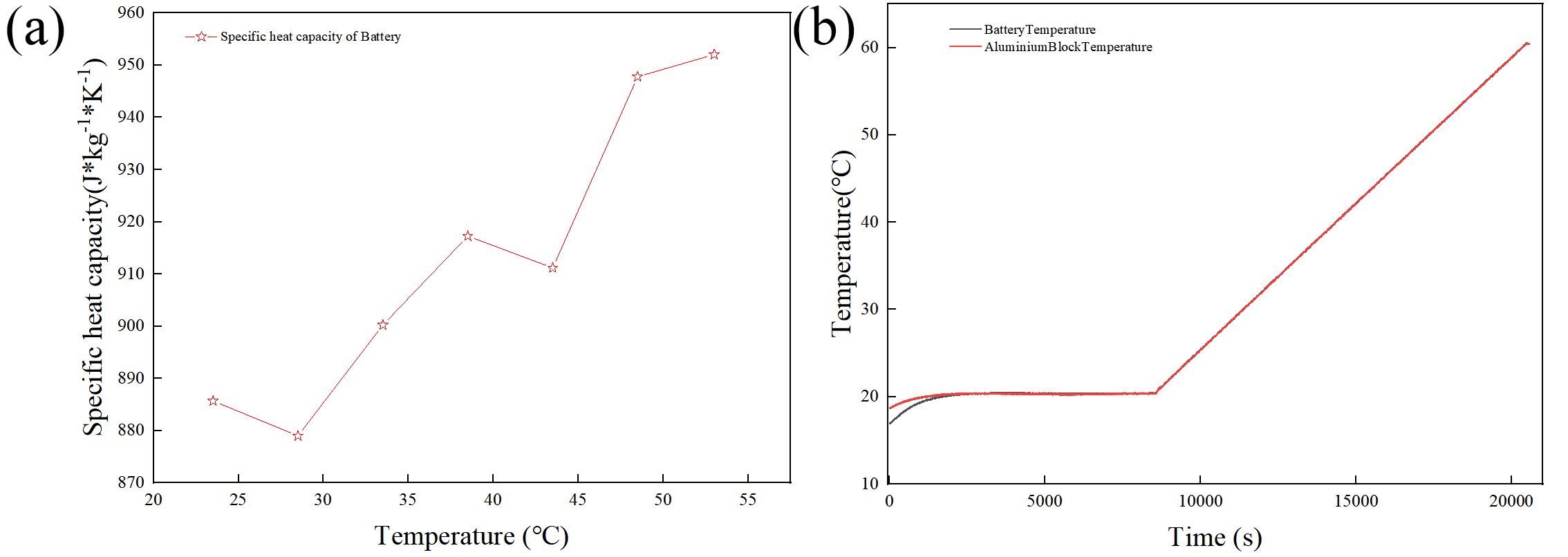 某18650电池(a)变温比热容和(b)绝热比热容温升图
