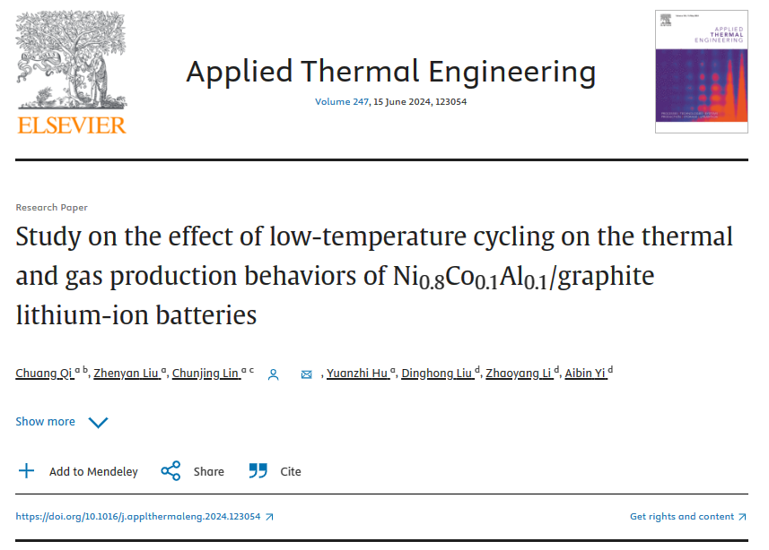 重庆理工大学齐创副教授、林春景副教授、刘真言同学等的课题组在 Applied Thermal Engineering 期刊发表题为 Study on the effect of low-temperature cycling on the thermal and gas production behaviors of Ni0.8Co0.1Al0.1/graphite lithium-ion batteries。本项目采用了仰仪科技小型电池绝热量热仪BAC-90A 作为主要测试仪器,通过对NCA811锂离子电池进行低温循环老化,并分析SOH与比热容、产热特性和产气特性的关系。