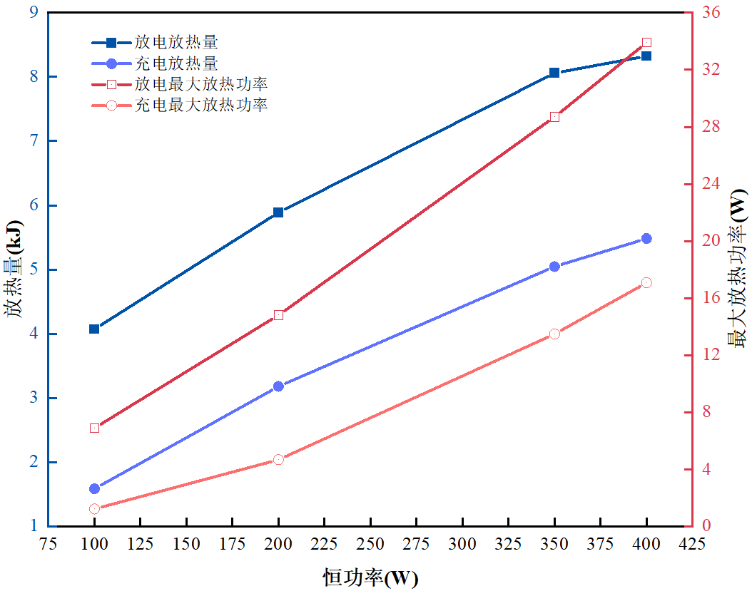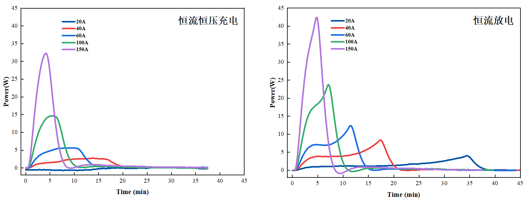 图3 锂离子电容器恒流恒压充电(左)和恒流放电(右)放热功率曲线