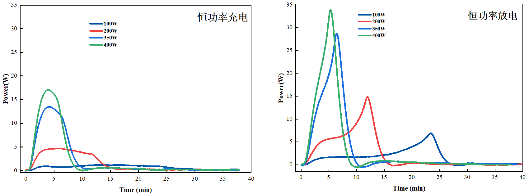 图5 锂离子电容器恒功率充电(左)和恒功率放电(右)放热功率曲线