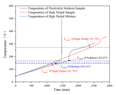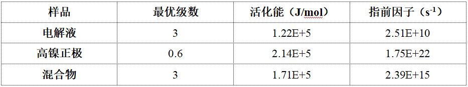 使用绝热量热仪可以对电池正负极材料、电解液等单组分或混合组分进行热分析,得到对应的起始分解温度、温升速率、压升速率、分解热量等数据,并进一步计算电池材料的热分解反应热力学与表观动力学参数;电池材料的热分解特性参数与电池单体的热失控参数进行对比分析,可以研究电池热失控的反应机理。使用TAC-500A对高镍正极材料、电解液及高镍正极材料+电解液的混合物分别进行热分解测试,结果如图3所示,并可根据热分解曲线,求解各试样的反应动力学参数如表1所示。