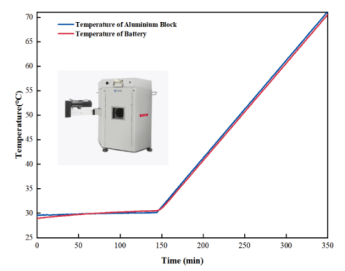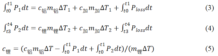 使用绝热量热仪可以对电池的比热容进行测试。实验中选用一个和电池同尺寸的铝块作为参比样,基于差示绝热追踪的原理如图10、11及式(3)、(4)、(5)所示,可以得到一定温度区间内的平均比热容和变温比热容。