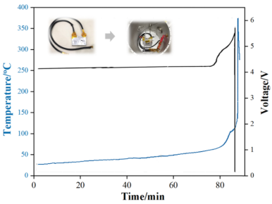 绝热量热仪可以连接充放电设备对电池的过充电、过放电、连续充放电等电滥用失控过程进行测试。使用BAC-420A对NCM电池进行过充电的热失控测试如图6所示。