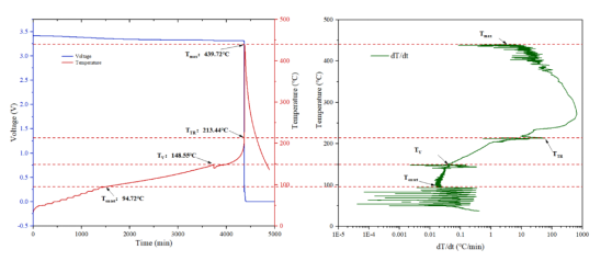 可以直接使用密闭式ARC如BAC-800B和BAC-1000A,或者使用泄压式ARC如BAC-420A并搭配耐压密封测试罐体,测试电池热失控过程中的产气变化。使用BAC-420A对160Ah的磷酸铁锂电池进行的热失控产气实验结果如图5所示,通过数据曲线可以对热失控过程的温度和压力变化进行同步分析,也可以结合理想气体状态方程计算反应过程的产气速率。需要注意的是,泄压式ARC搭配密封测试罐进行热失控产气实验时,由于密封测试罐给实验样品引入热惰性因子,会使“HWS模式”测试得到的Tonset偏高。