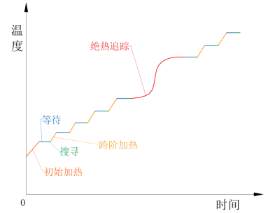 为了能够使试样在实验过程中在相对绝热的环境中检测出其初始反应温度,使用“HWS”的升温程序,即“加热-等待-搜寻”的台阶升温模式,如图2所示。“HWS”模式可以保证每个台阶的最后阶段均给样品提供较好的绝热环境,因此当“搜寻”出的试样温升速率超过一定阈值后,实验就会进入绝热追踪阶段,该阶段内炉体温度会随样品温度的变化而即时调整,确保试样始终处于动态热封闭状态。