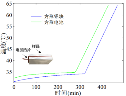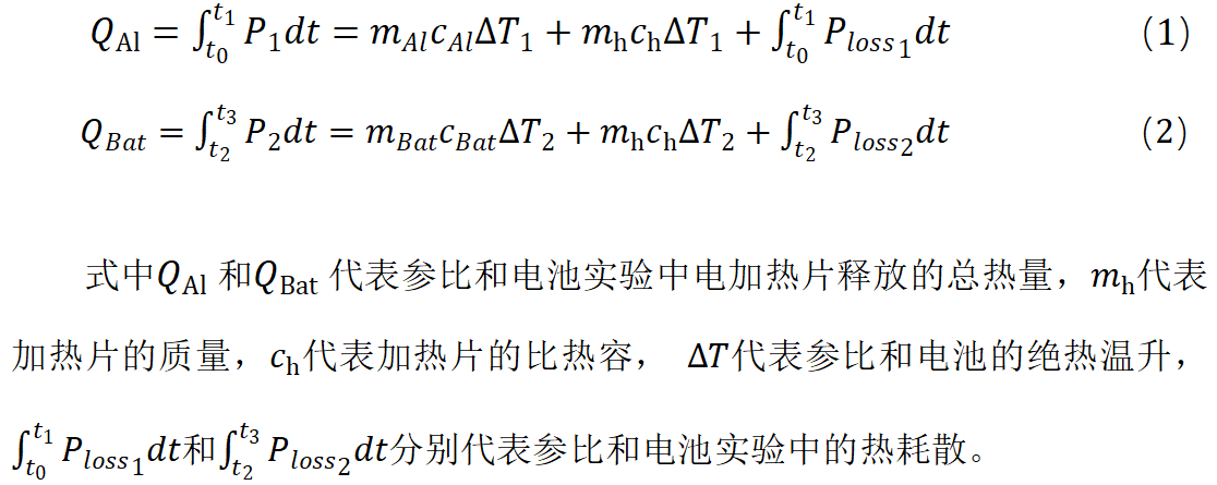 比热容测试基于差示绝热追踪的原理。简而言之,在量热仪的绝热追踪工作模式下,利用柔性电加热片对锂电池与已知比热容的标准样品(通常为铝质)进行加热,并尽量控制样品与参比的升温历程一致。根据式(1)和式(2),利用参比可计算和扣除由于测试过程中实验环境难以达到完全理想绝热而耗散至环境中的热量,从而精确测量锂电池比热容。