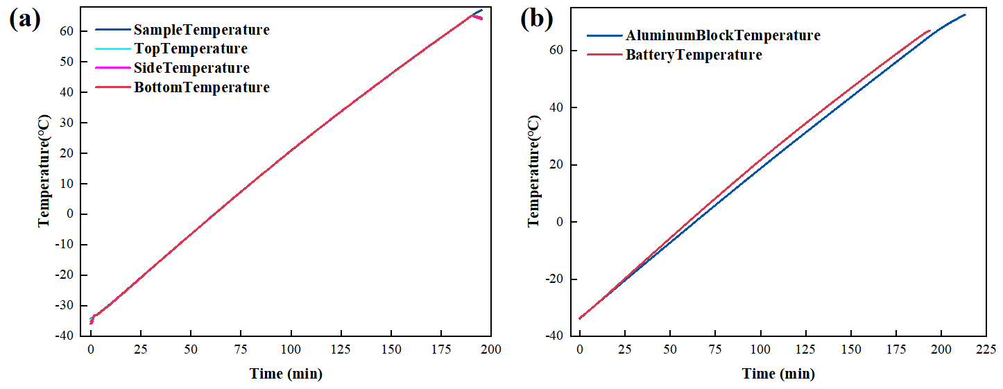 如图3(a)所示,实验过程中量热腔炉体温度与样品温度始终保持紧密贴合,温差低于±0.2℃。准绝热测试环境封闭了样品的热耗散,能够显著降低难以准确测量的不确定项所引入的系统误差。图3(b)为电池及参比在比热容实验中的温升曲线,由于两者热容存在差异性,因此相同加热功率下温升速率不完全一致。图3(c)显示了测定得到的电池变温比热容曲线(每5℃平均),可以发现随着温度上升,比热容呈单调上升趋势。同时可计算得到电池在-30℃到65℃范围内的平均比热容为1024.64kJ/(kg*℃)。