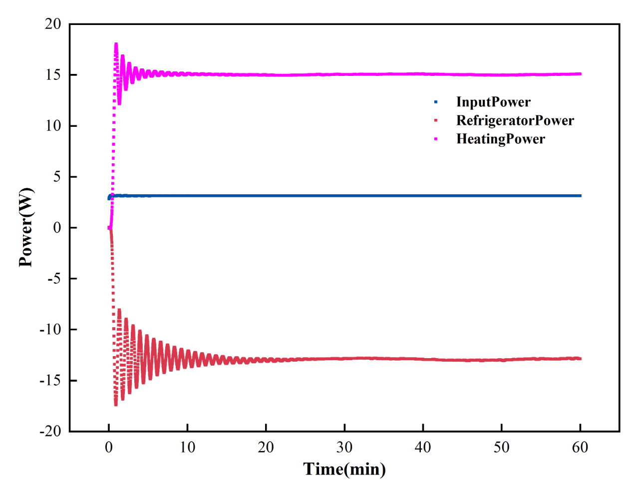 25℃恒流1A条件下TEC输入和输出功率-时间曲线如图4所示,TEC在恒温恒流工况下,输入功率较为稳定,输出功率(制热功率及制冷功率)在短暂的波动后也趋于稳定。