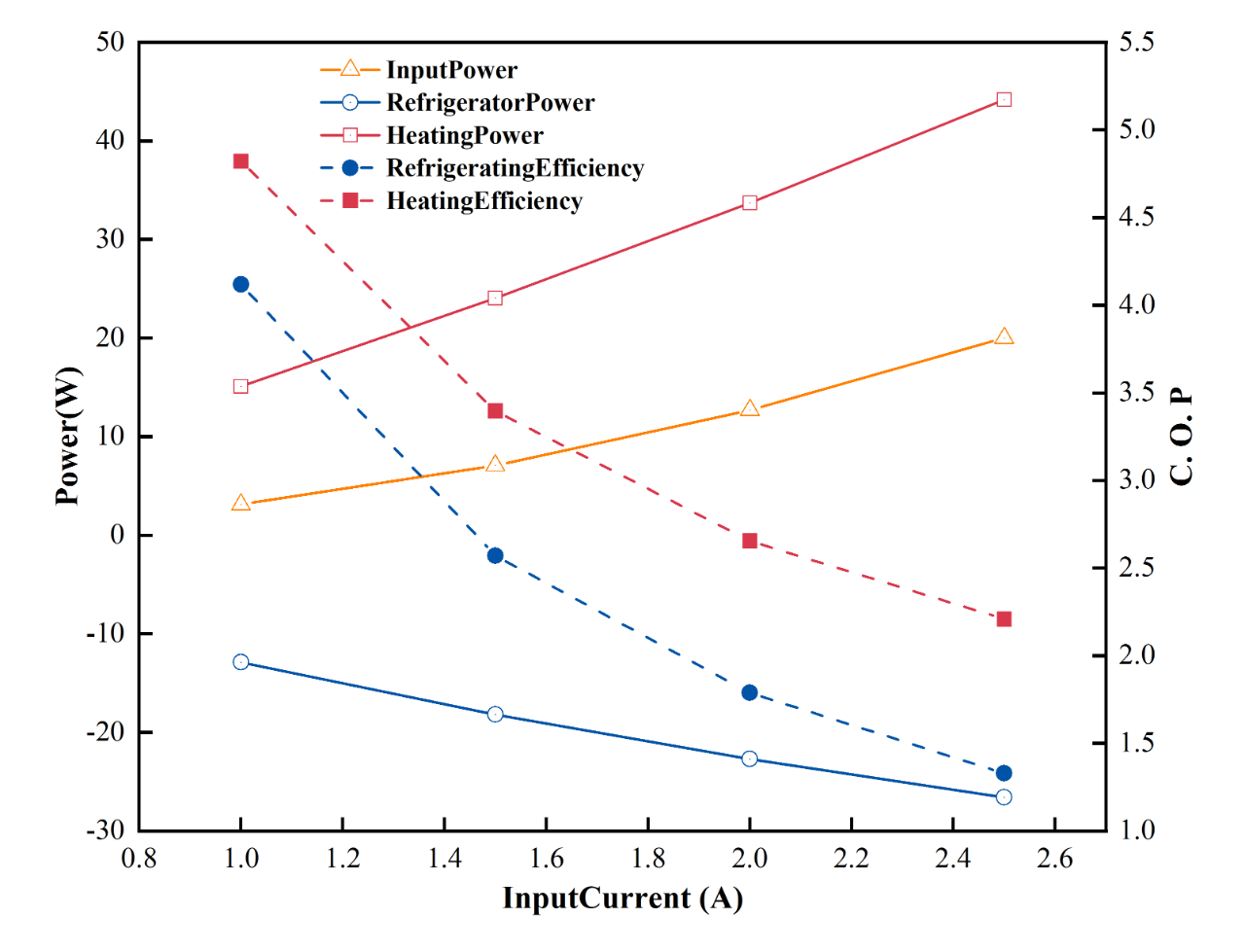 但在满足制冷需求的基础上,为提高能源利用率,TEC系统工作的电流不宜过大。另一方面,不同工作电流下TEC的制冷效率都比制热效率低,主要受Joule热效应的影响。