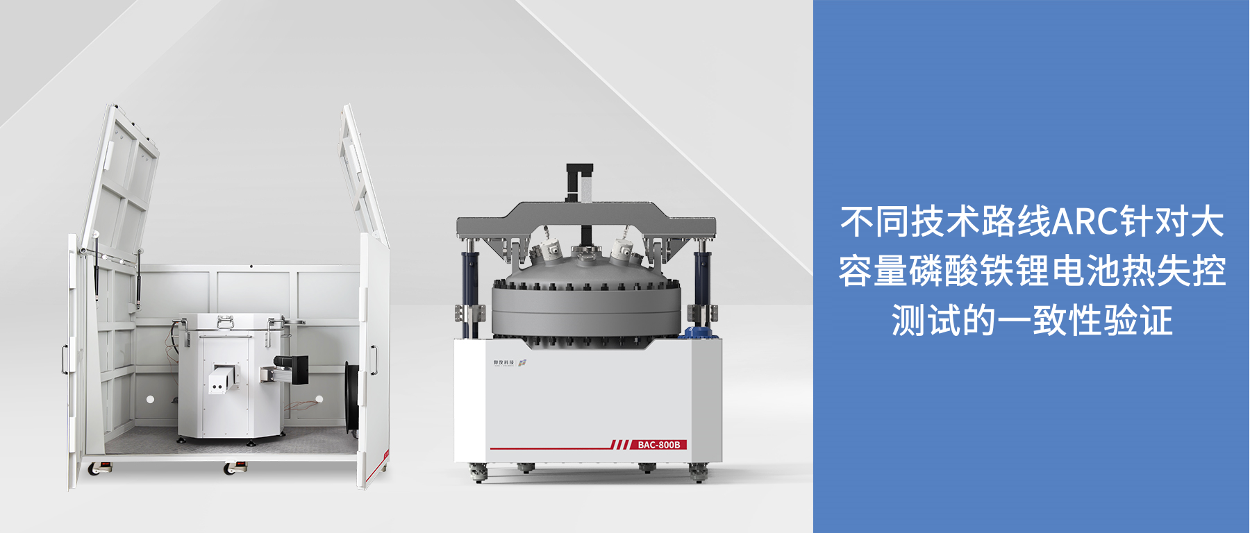 本次实验采用BAC-800B与BAC-420A大型电池绝热量热仪对磷酸铁锂电芯进行绝热热失控测试。为确保数据对比的有效性,实验选用同一批次的两个500Ah+磷酸铁锂电池,其中BAC-800B在测试温度与电压参数的同时同步进行密封产气测试,BAC-420A仅测试温度与电压数据,其余实验条件(包括附加热电偶配置、夹具规格等)均保持一致。