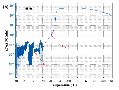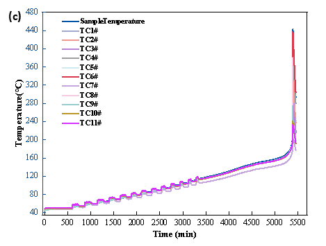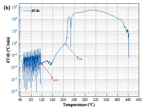 图4 BAC-420A电池热失控(a)温度&电压曲线、(b)温升速率-温度曲线和(c)样品热电偶及附加热电偶温升曲线