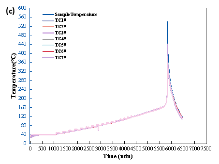 图3 BAC-800B电池热失控(a)温度&电压曲线、(b)温升速率-温度曲线和(c)样品热电偶及附加热电偶温升曲线