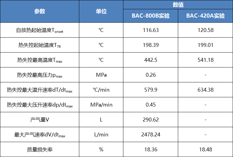 相较于之前的绝热量热仪,密闭型电池绝热量热仪可获得更多的绝热热失控数据,同时保证了绝热性能的准确可靠性,即获得准确可靠的温度数据。另外,同一个电池的热失控数据在两种不同仪器上的复现性也是许多人关注的重点。因此,本次实验选用了两个500Ah+磷酸铁锂电池分别在BAC-420A及BAC-800B开展测试。