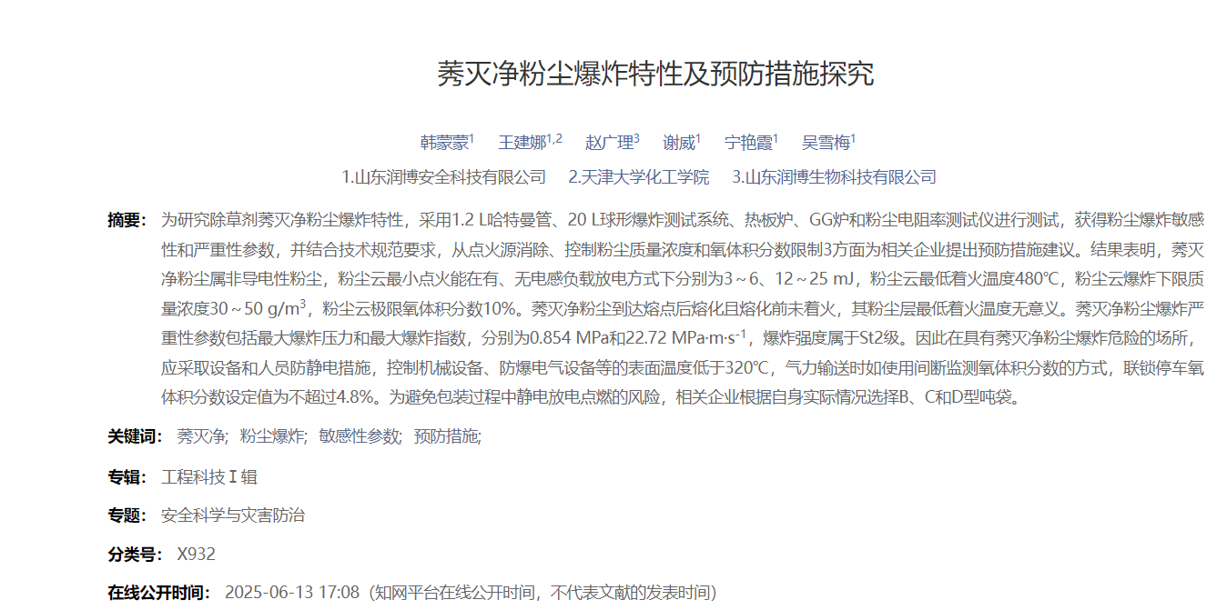 近期,山东润博安全科技有限公司高级工程师韩蒙蒙等人在《工业安全与环保》(Industrial Safety and Environmental Protection)期刊发布《莠灭净粉尘爆炸特性及预防措施探究》的论文,该论文由山东润博安全科技有限公司、天津大学化工学院和山东润博生物科技有限公司联合支持。