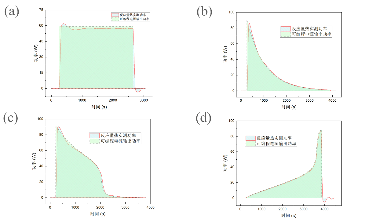 图3 焦耳热模拟的(a)间歇零级反应、(b)间歇二级反应、(c)半间歇二级反应和(d)自由基聚合反应放热测量结果