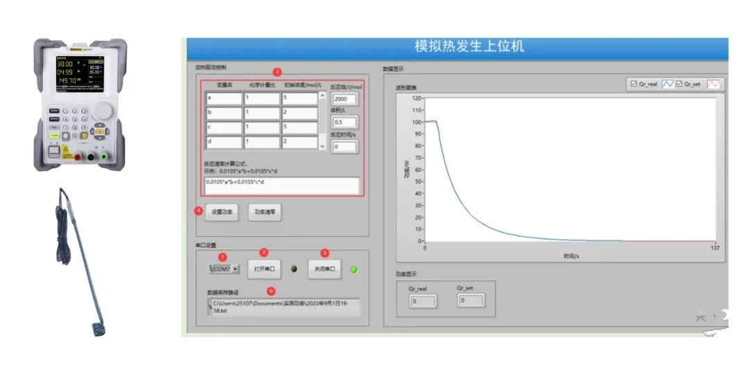 图2 电源、加热棒(左)以及模拟热发生上位机界面(右)