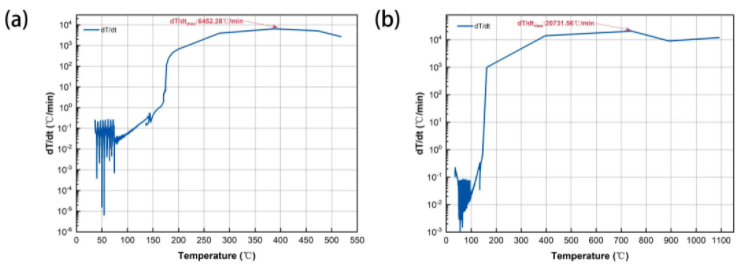 根据测试数据,9系三元锂电池自放热起始温度Tonset为86.78度,热失控起始温度TTR为202.76度,电池电压的骤降点与TTR温度基本一致。电池到达TTR之后具有极高的温升速率,2s内电池表面温度达到热失控最高温度1109℃,最大升温速率约为48900℃/min。与9系锂电池相比,如图2所示,6系电池从TTR到达Tmax需要70s,最大升温速率约为6500℃/min;8系电池需要5s,最大升温速率约为20600℃/min,说明随着镍含量的上升,电池热失控剧烈程度不断提高。