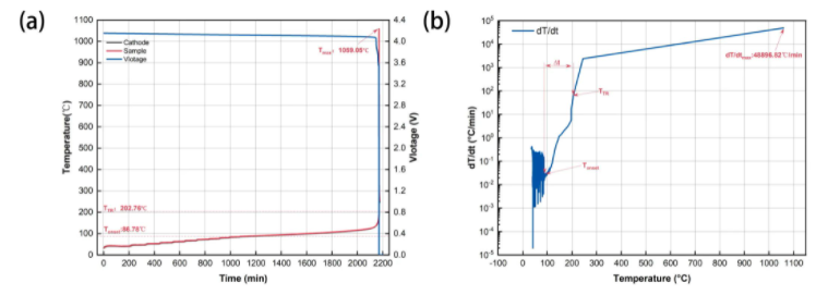 图1 9系三元锂电池热失控(a)温升及电压曲线及(b)温升速率-温度曲线