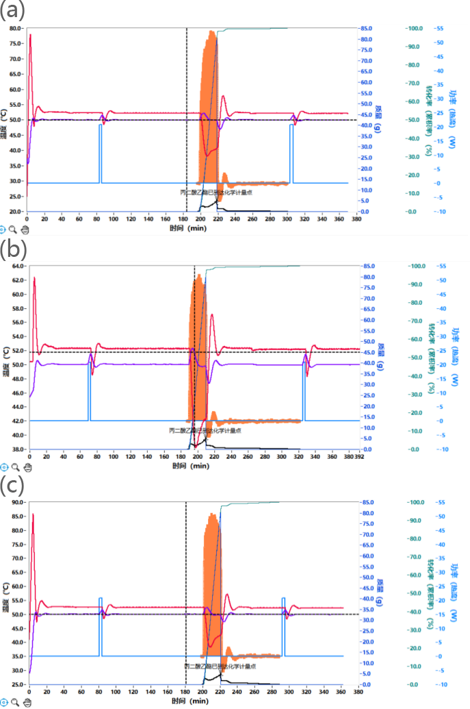 以丙基丙二酸二乙酯水解反应的比放热焓( QR = 99.1-107.3 kJ/mol )[1]作为参考,丙二酸二乙酯水解的反应量热结果与其文献数据接近。随后进一步重复实验以验证量热结果的一致性。3次测试的量热结果如图3所示,橘黄色的热流曲线表明反应放热趋势一致。