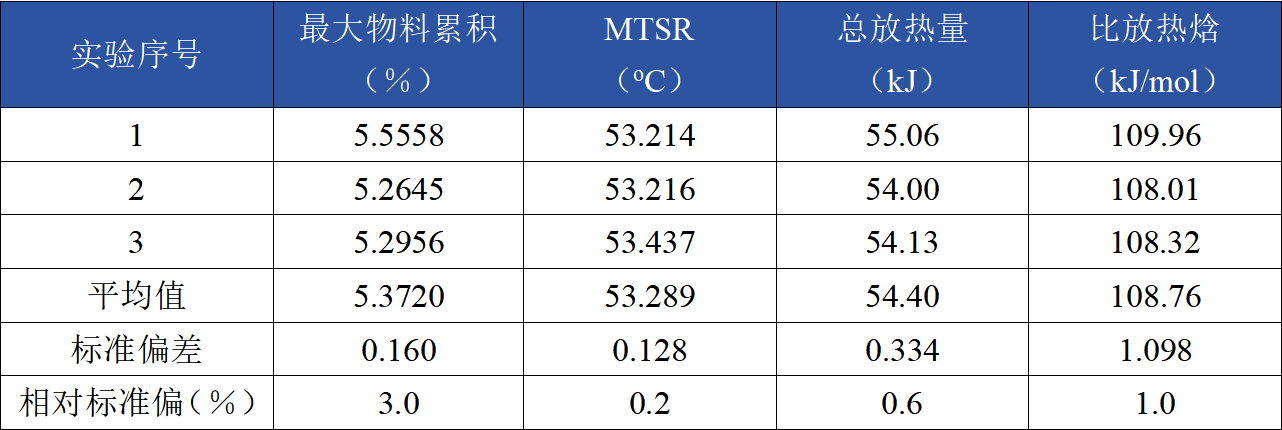 根据上述数据,3次丙二酸二乙酯水解实验的比放热焓标准偏差为1.0%,证明量热结果具有良好的一致性;同时与文献对比,量热结果的可信度高。因此,丙二酸二乙酯水解反应适合作为标准反应体系开展量热仪整体性能评价。根据实验结果,建议反应比放热焓参考值为109±2 kJ/mol。
